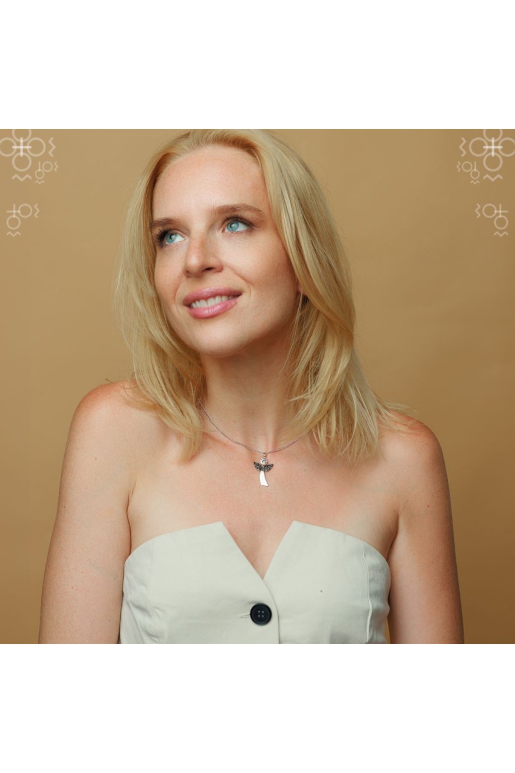 Elegantní, ručně vyráběný náhrdelník z českých krystalů v čiré (crystal) barvě. Design andílka, který se stal celosvětovým trendem, pochází právě od naší firmy HGM. Pouze u nás máte jistotu, že se jedná o skutečný originál. Na každém kousku najdete vyražené logo naší společnosti pro zajištění autenticity šperku. Andílek štěstí je doplněn o kamínek s výbrusem rivoli o velikosti 6 mm. Velikost andělíčka je 2 x 3,5 cm. Délka řetízku je 42 cm. Na konci je také prodlužovací řetízek o délce 7 cm. Náhrdelník si tak můžete nastavit přesně dle Vašich potřeb. Náhrdelník je v povrchové úpravě Rhodium, která zvyšuje jeho životnost a je hypoalergenní. Náhrdelník je navržen a vyroben v Jablonci nad Nisou.