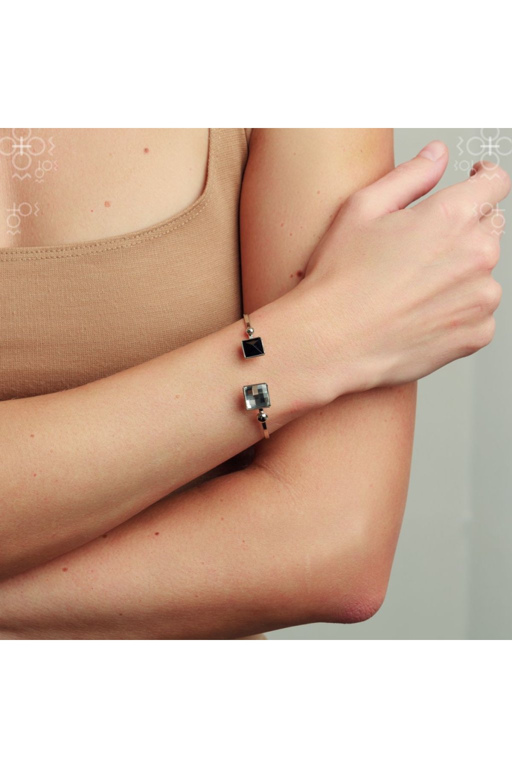 Elegantní ručně vyráběný náramek se Swarovski® crystals v čiré (crystal) barvě a černým kamenem. Design šperku ve spojení s geometrií dodá i v tomto případě eleganci každé ženě. Náramek ve velikosti 6x7 cm, který si můžete nastavit (roztáhnout) přesně dle vašich potřeb. Náramek je v povrchové úpravě Rhodium, která zvyšuje jeho životnost a je antialergenní. Výrobek dostanete zabalený v dárkové krabičce. Náramek je navržen a vyroben v Jablonci nad Nisou firmou FaBOS.