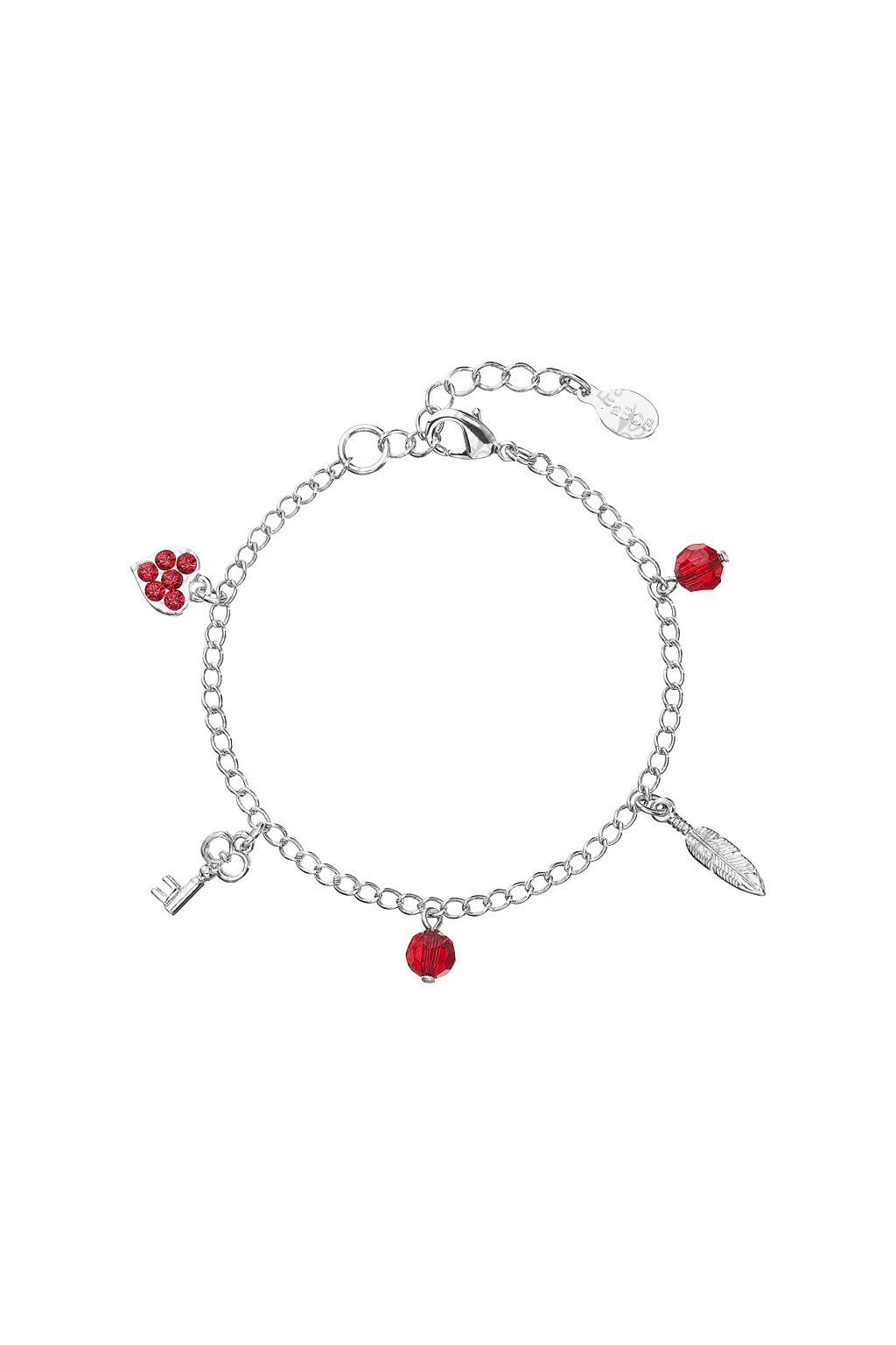 Elegantní ručně vyráběný náramek symbolizující lásku. Řetízek s přívěsky klíčku, pírka, srdíčka s blyštivými kamínky, prokládaný červenými korálkami. Délka náramku je 16 cm, který má na konci prodlužovací řetízek o délce 3 cm, náramek si tak můžete nastavit přesně dle vašich potřeb. Náramek je v povrchové úpravě Rhodium, která zvyšuje jeho životnost a je antialergenní. Výrobek dostanete zabalený v dárkové krabičce. Náramek je navržen a vyroben v Jablonci nad Nisou firmou FaBOS.